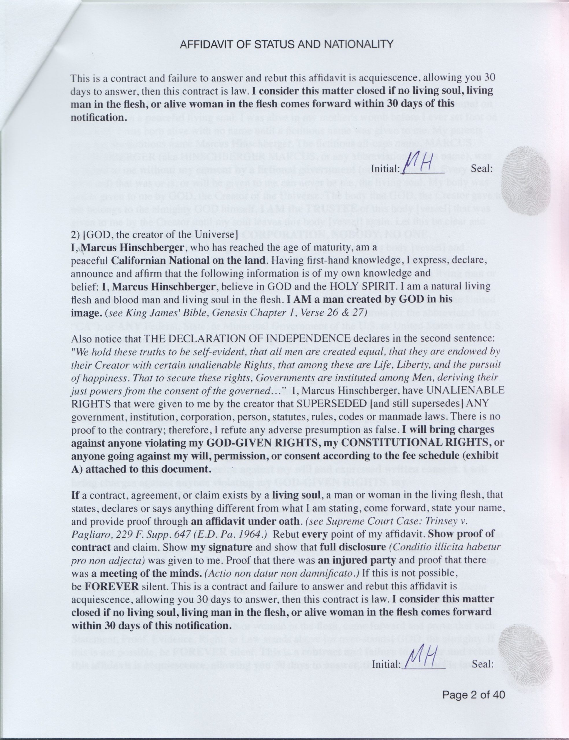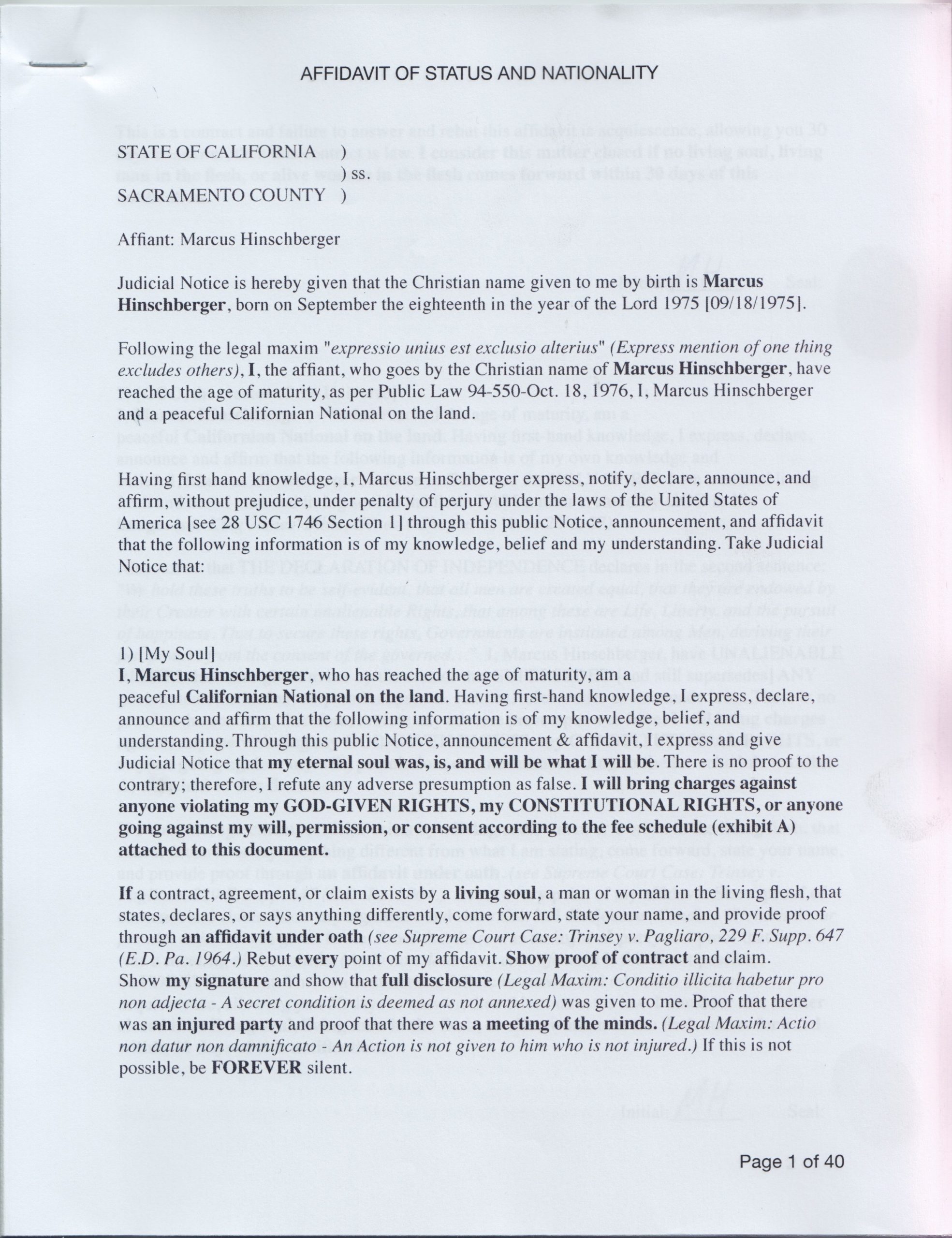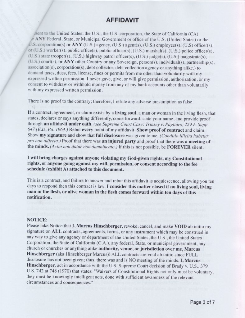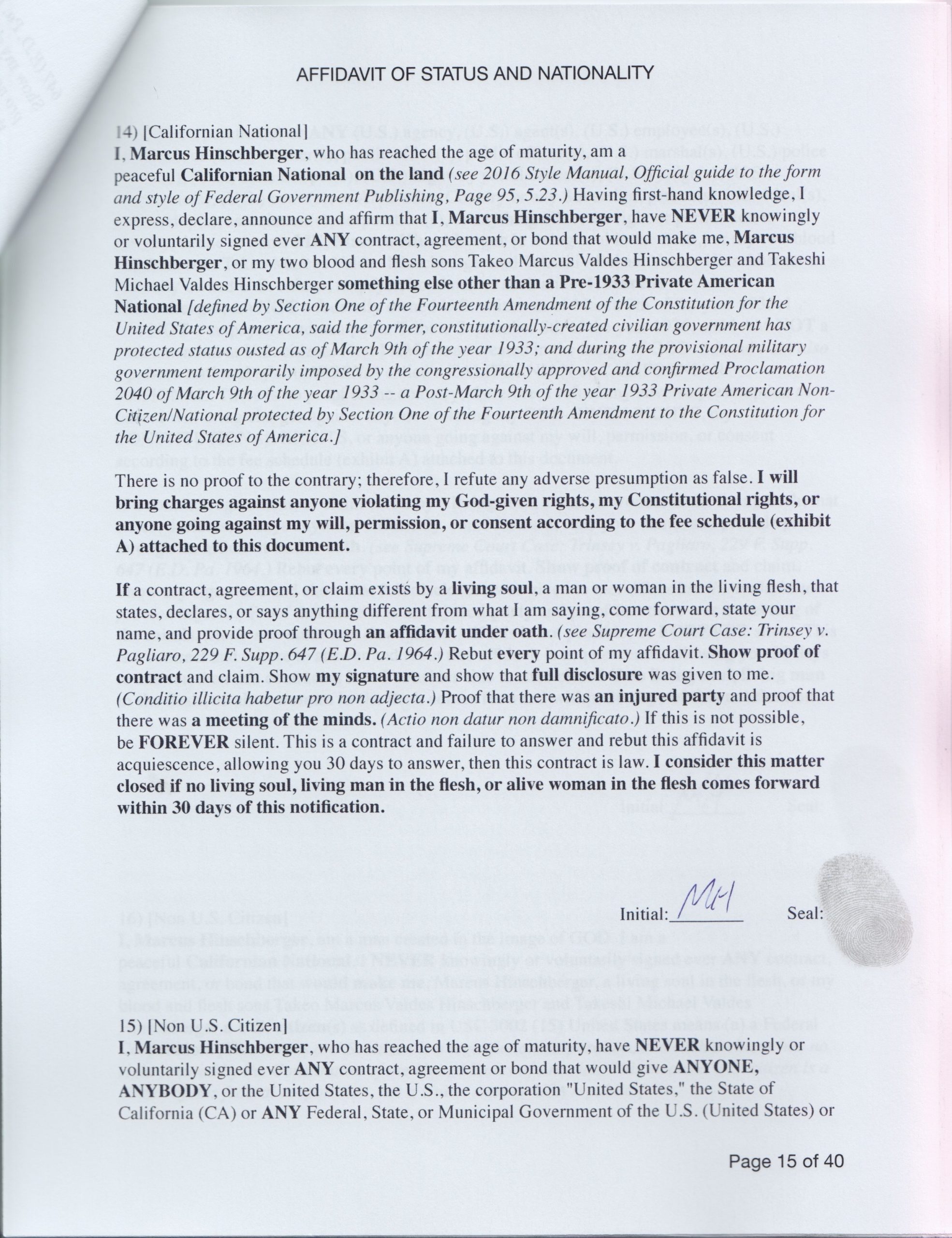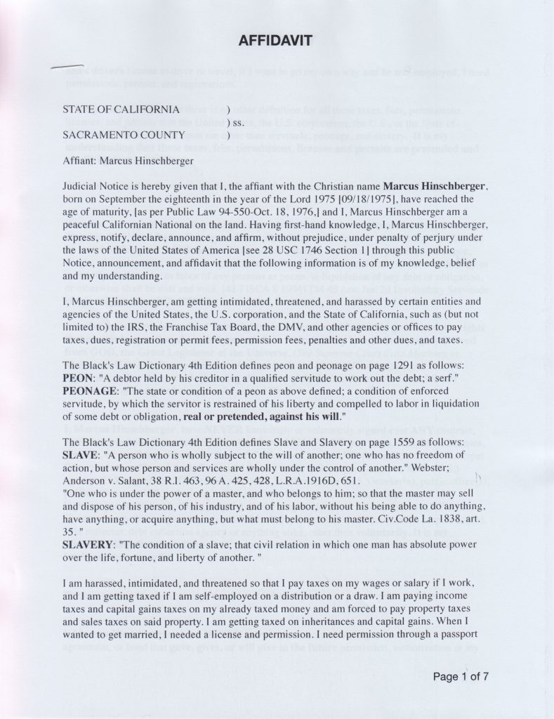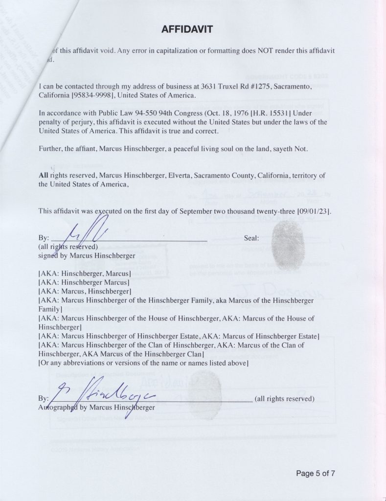 The affiant Marcus Hinschberger, a peaceful, non-combatant Californian National, publishes the following Notices and/or Affidavits on this page.
