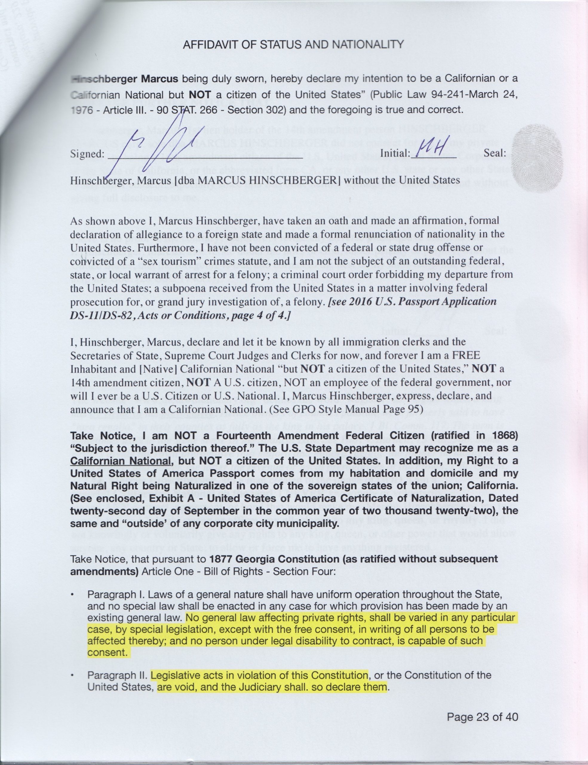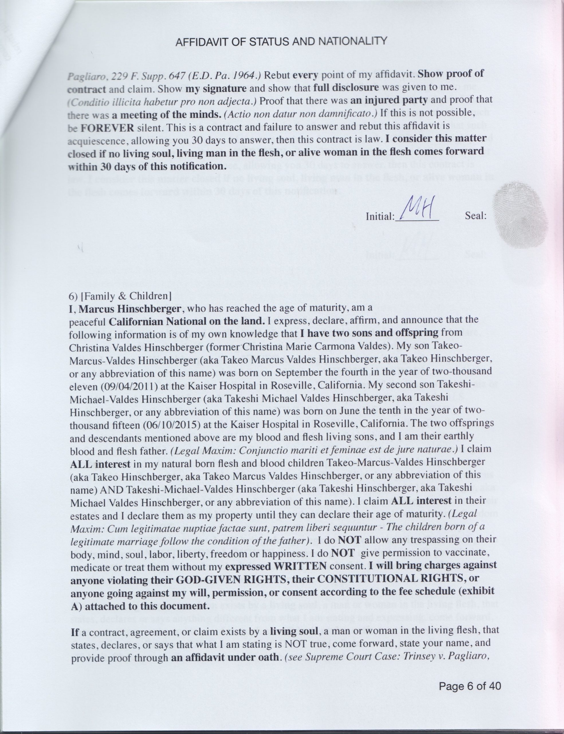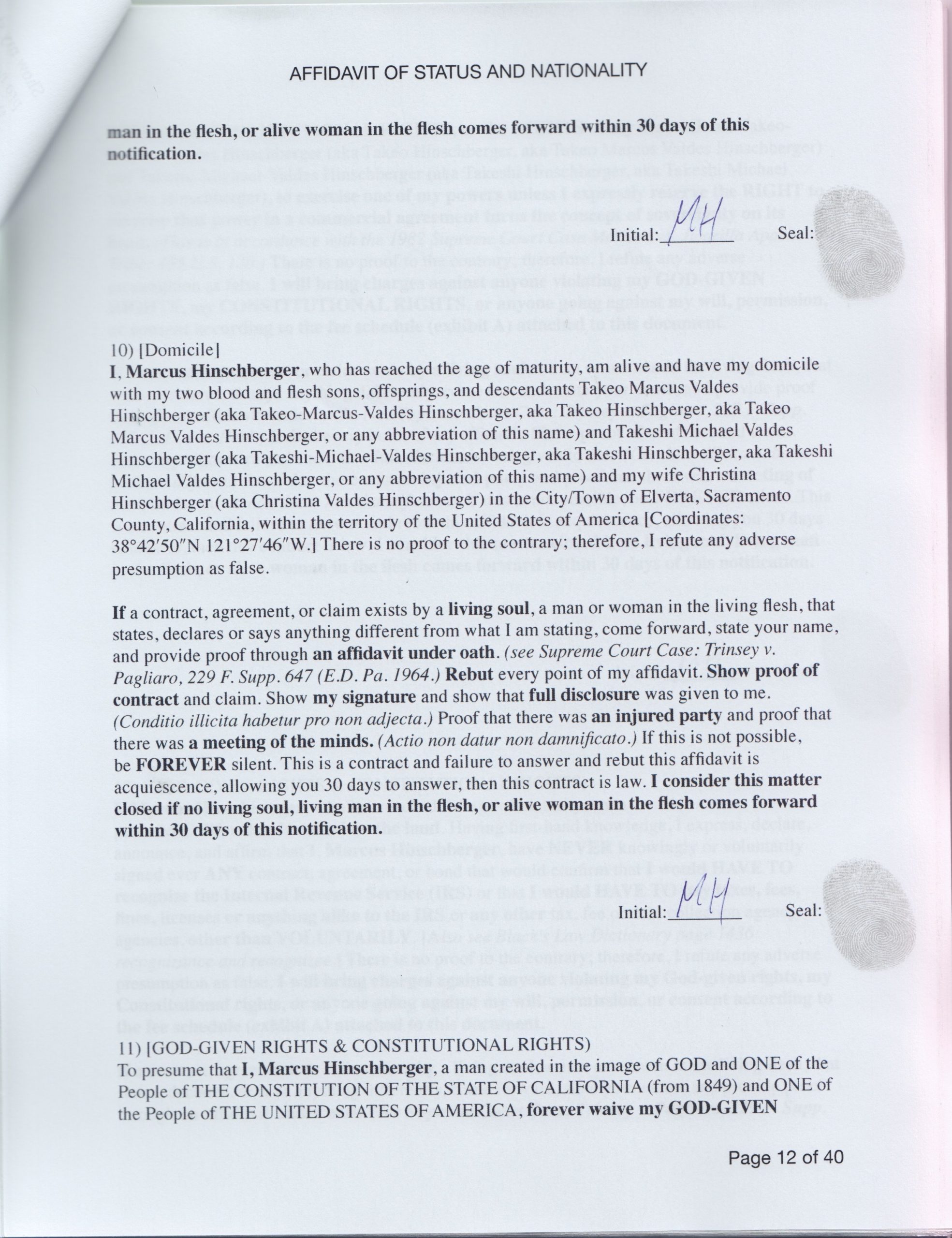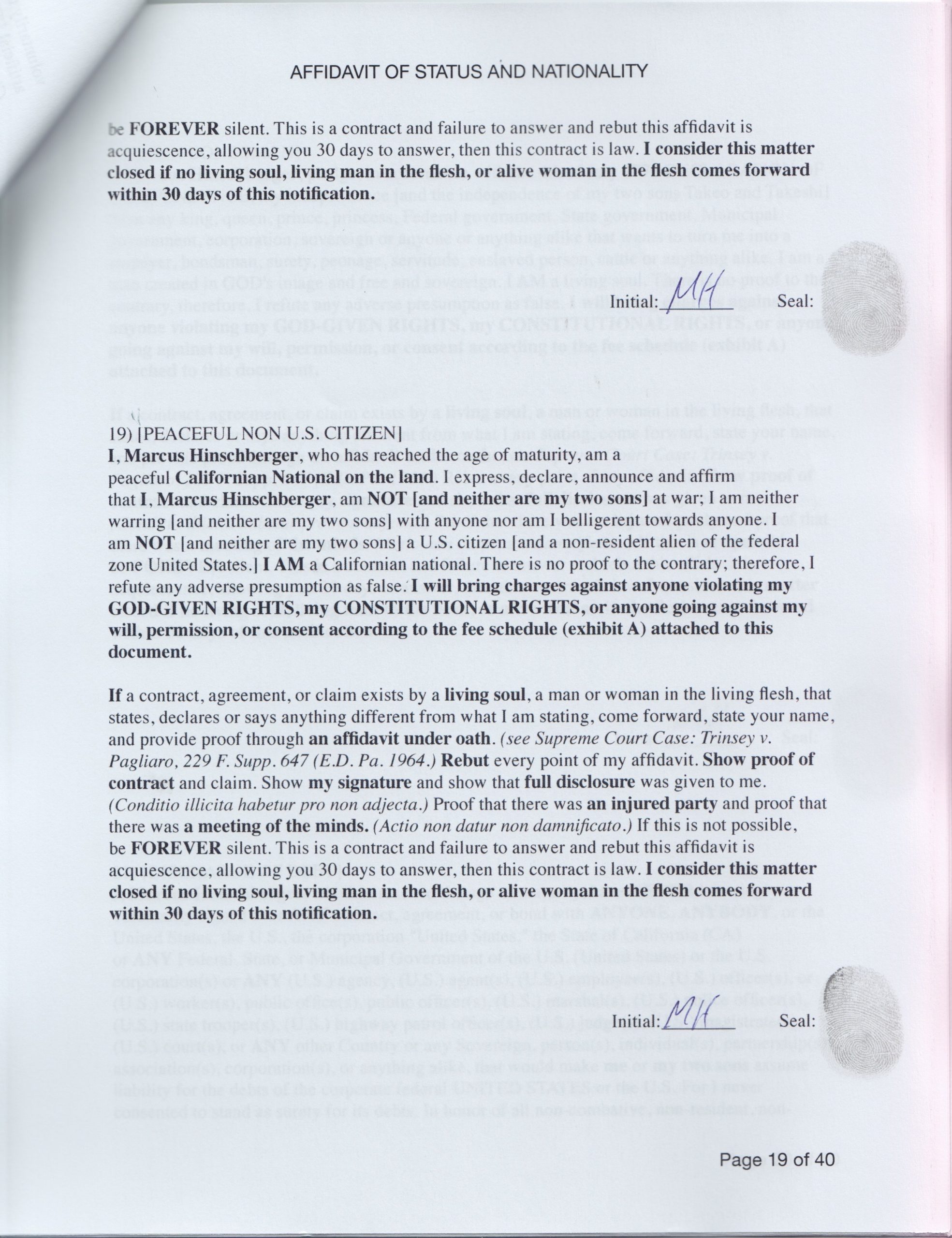 The affiant Marcus Hinschberger, a peaceful, non-combatant Californian National, publishes the following Notices and/or Affidavits on this page.