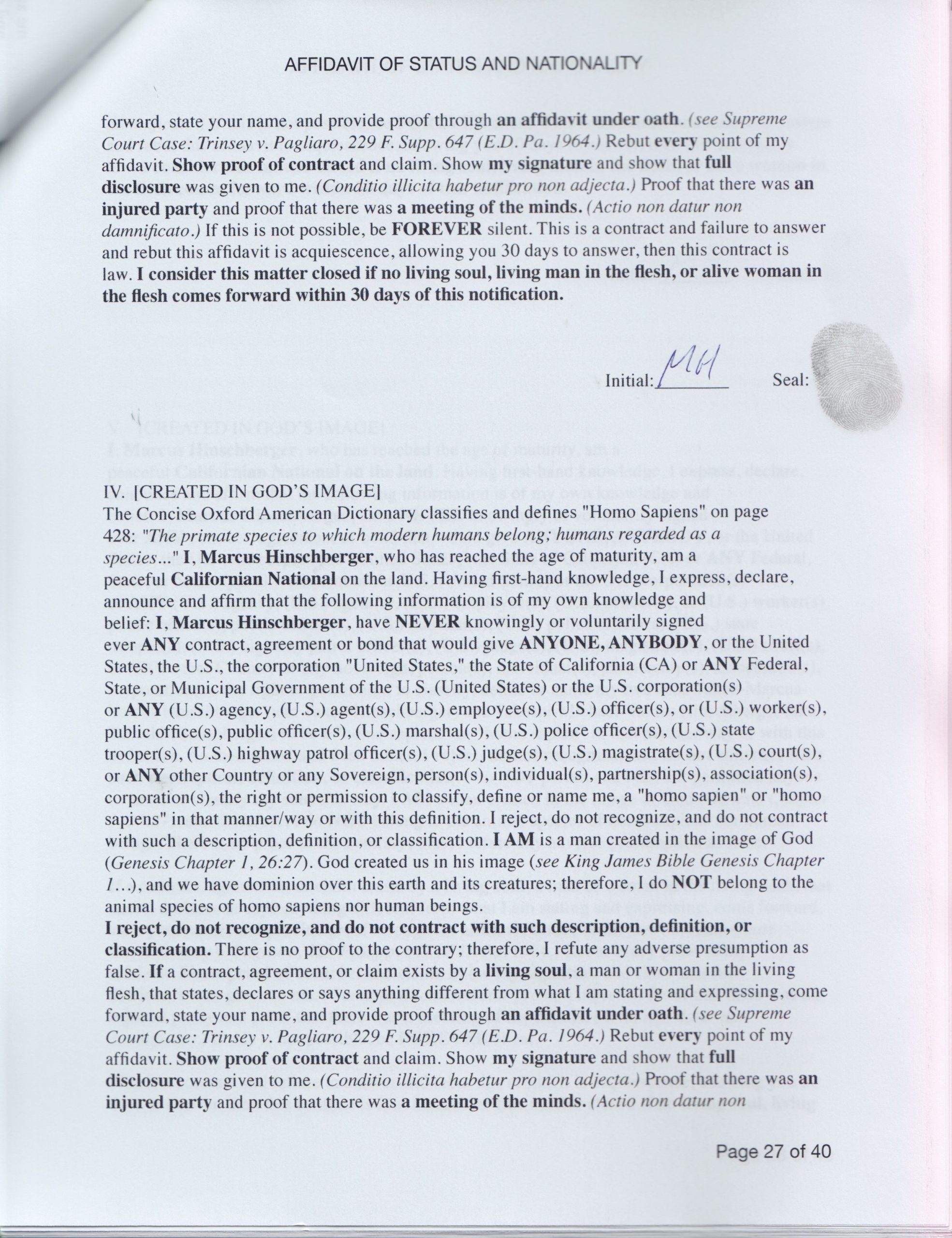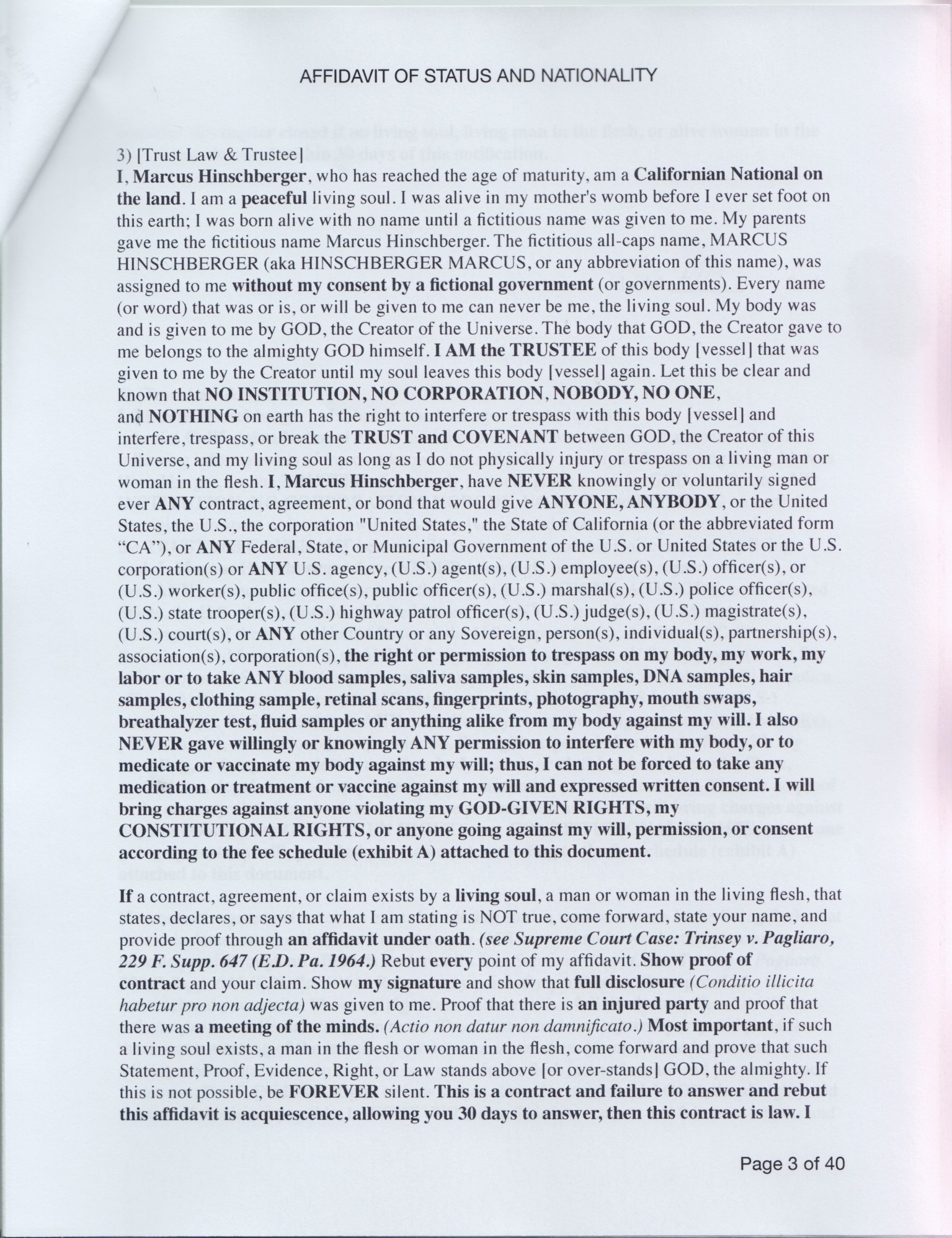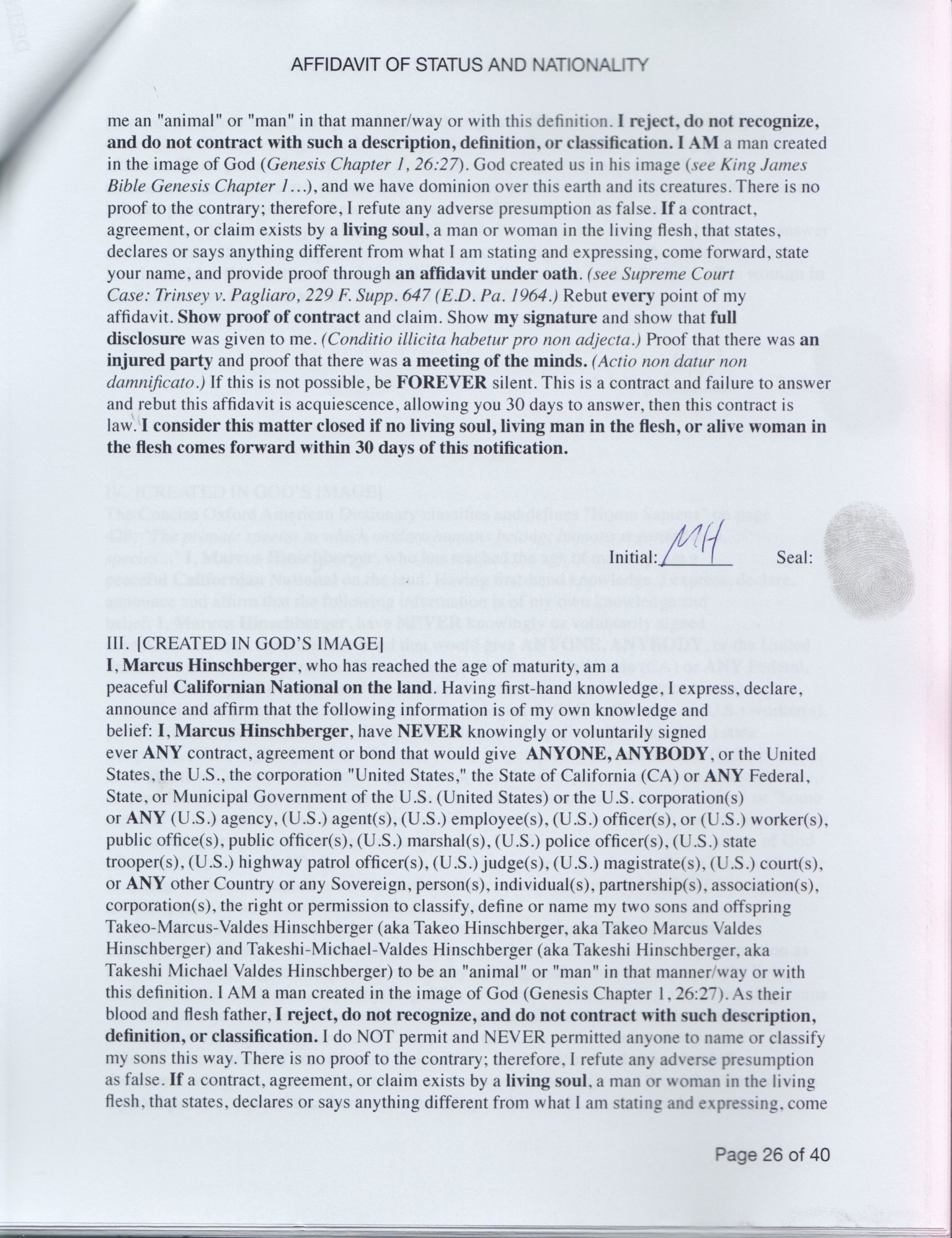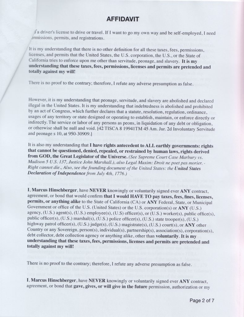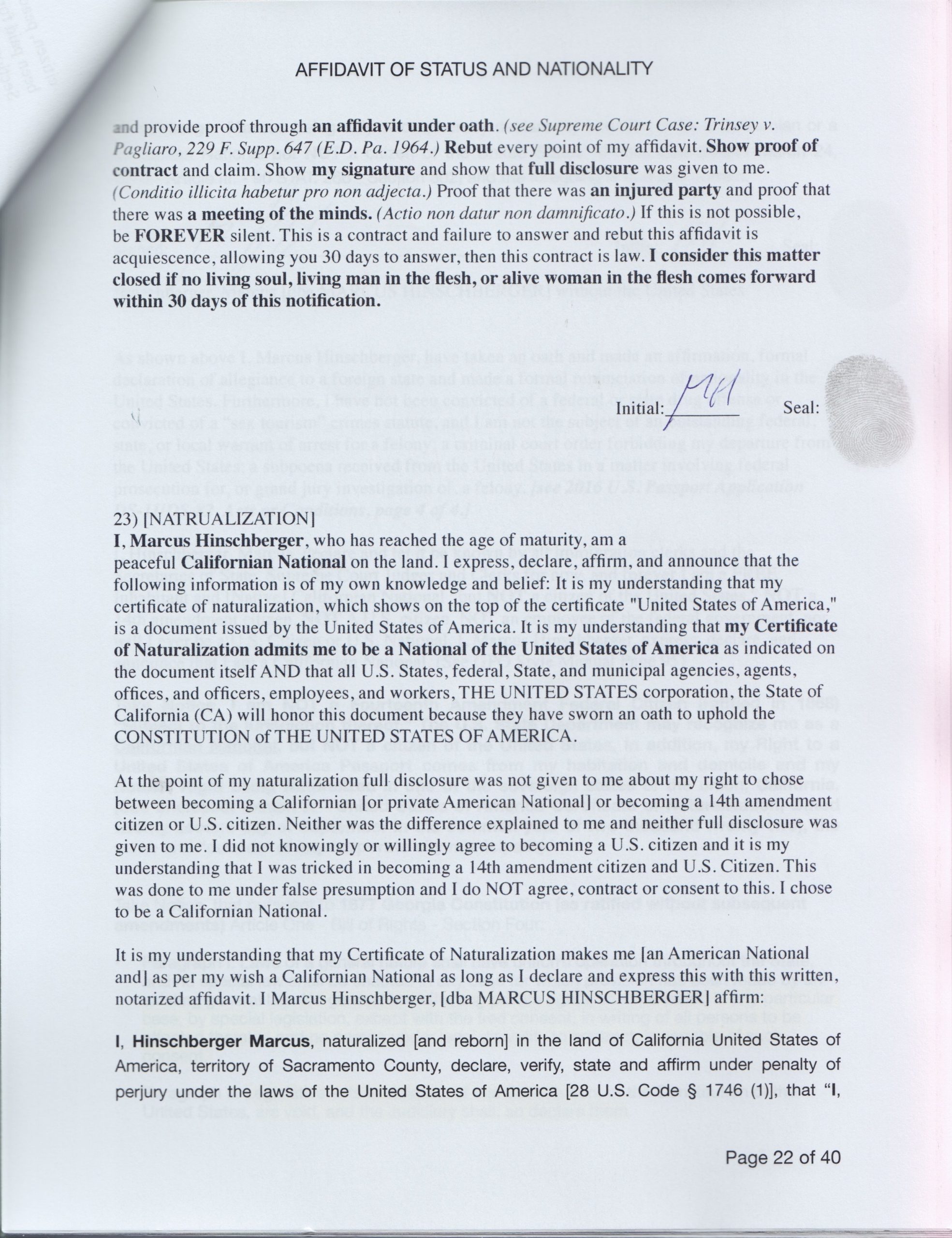 The affiant Marcus Hinschberger, a peaceful, non-combatant Californian National, publishes the following Notices and/or Affidavits on this page.