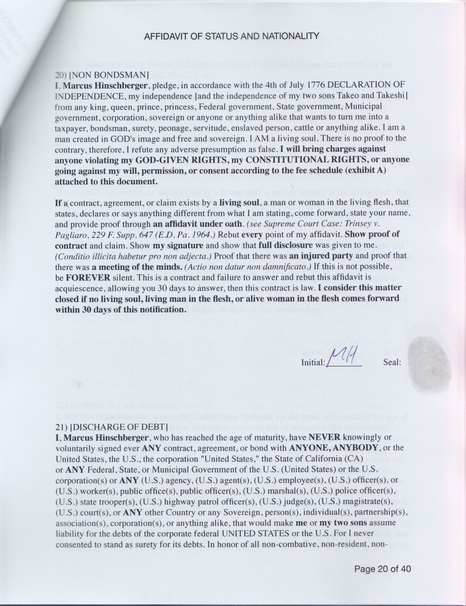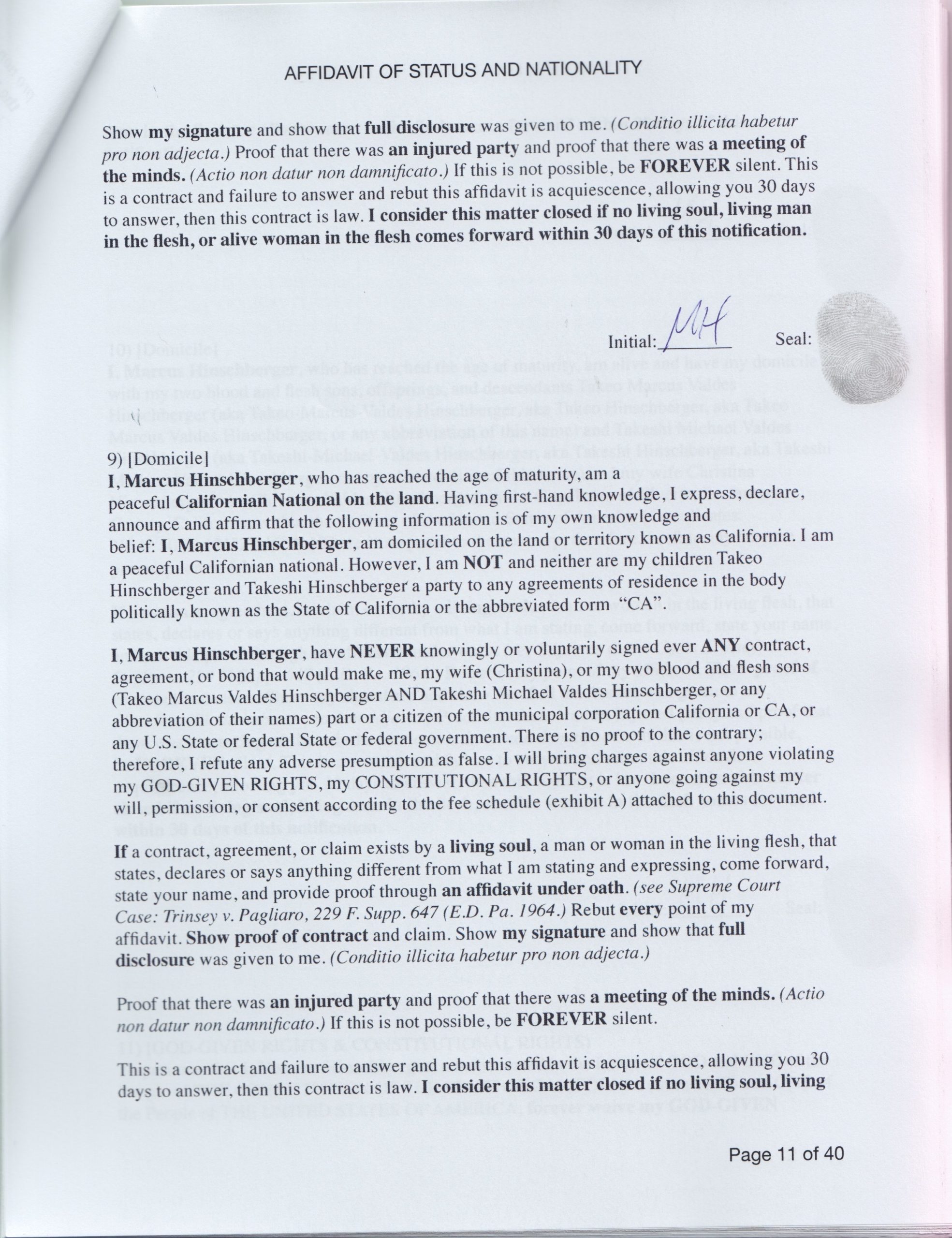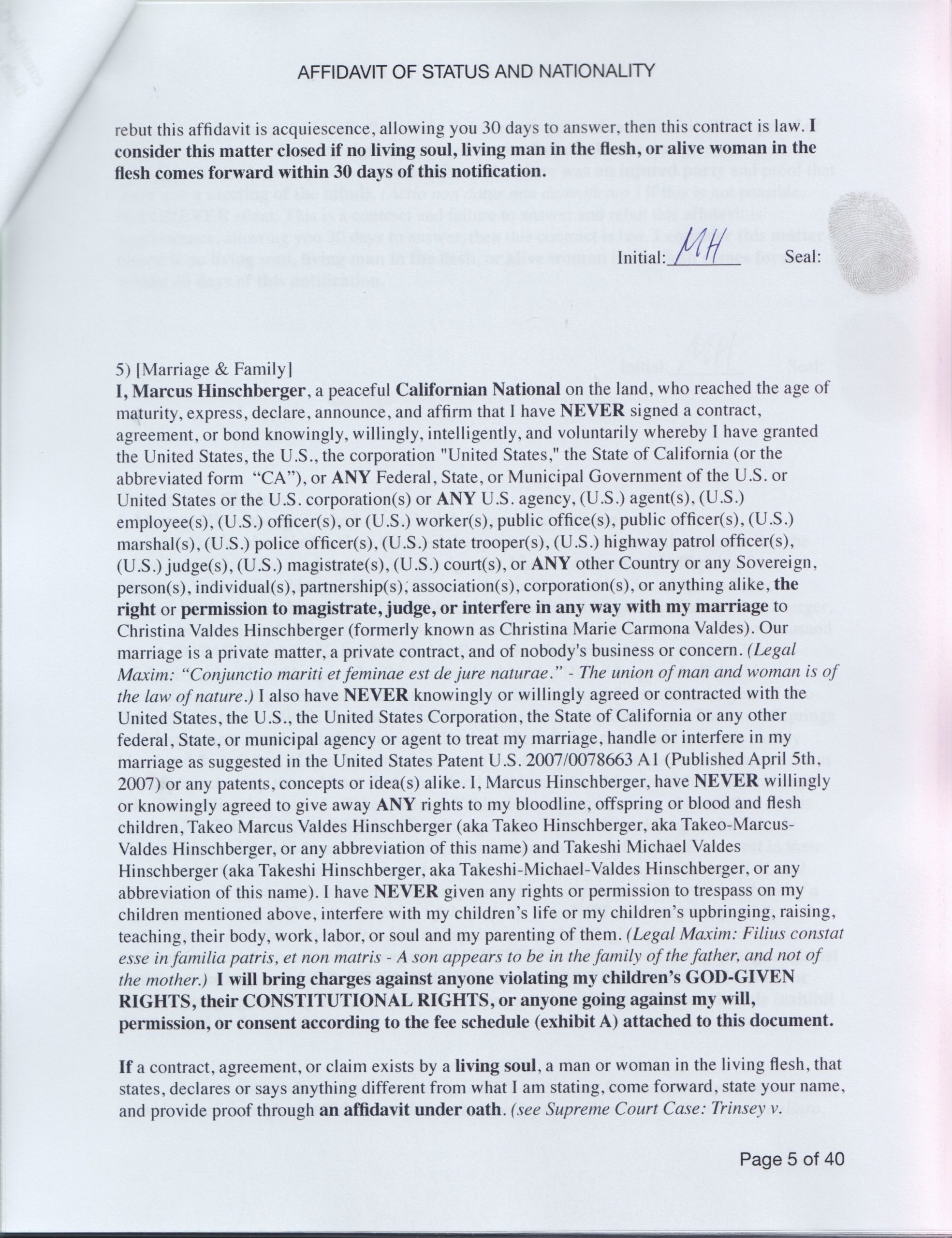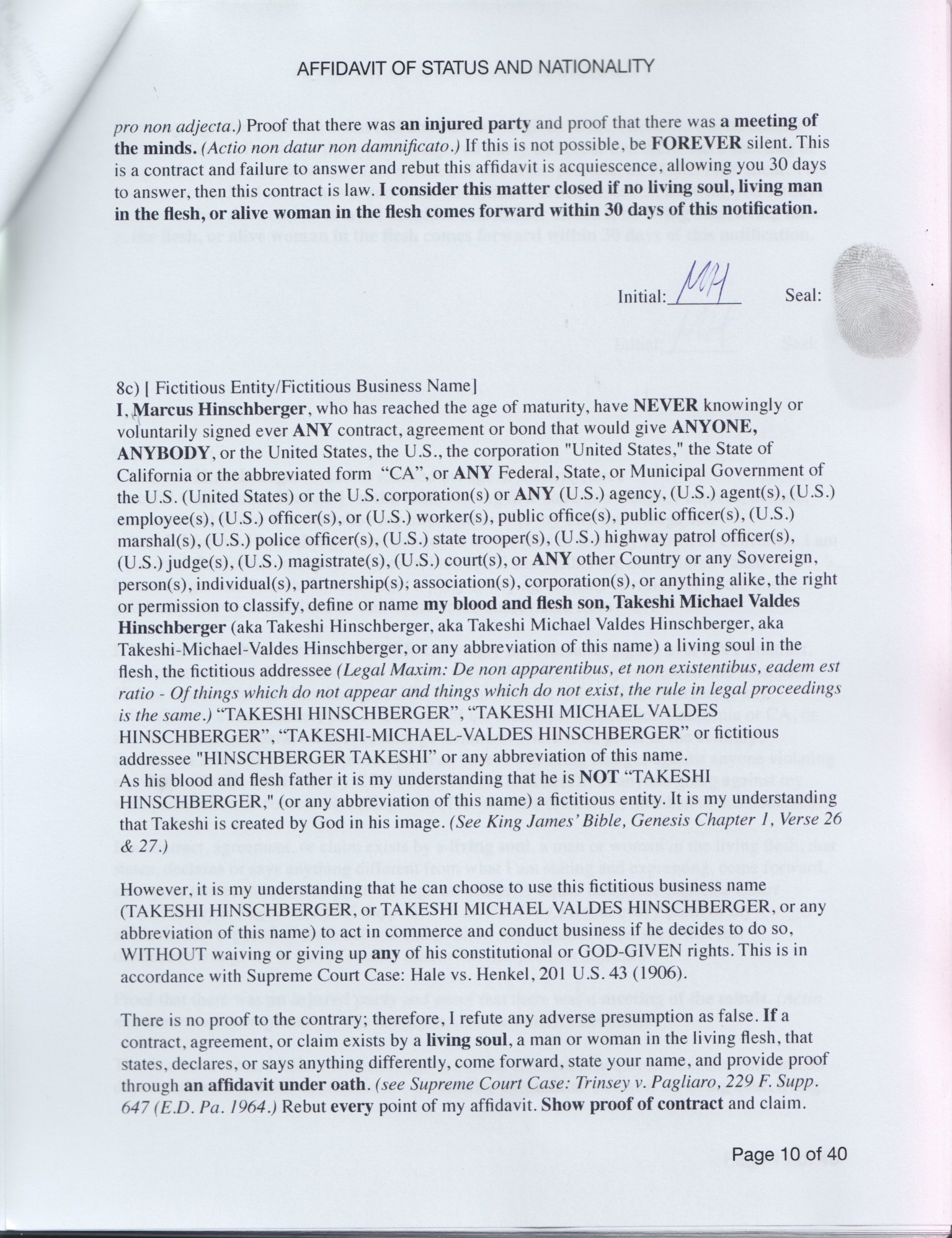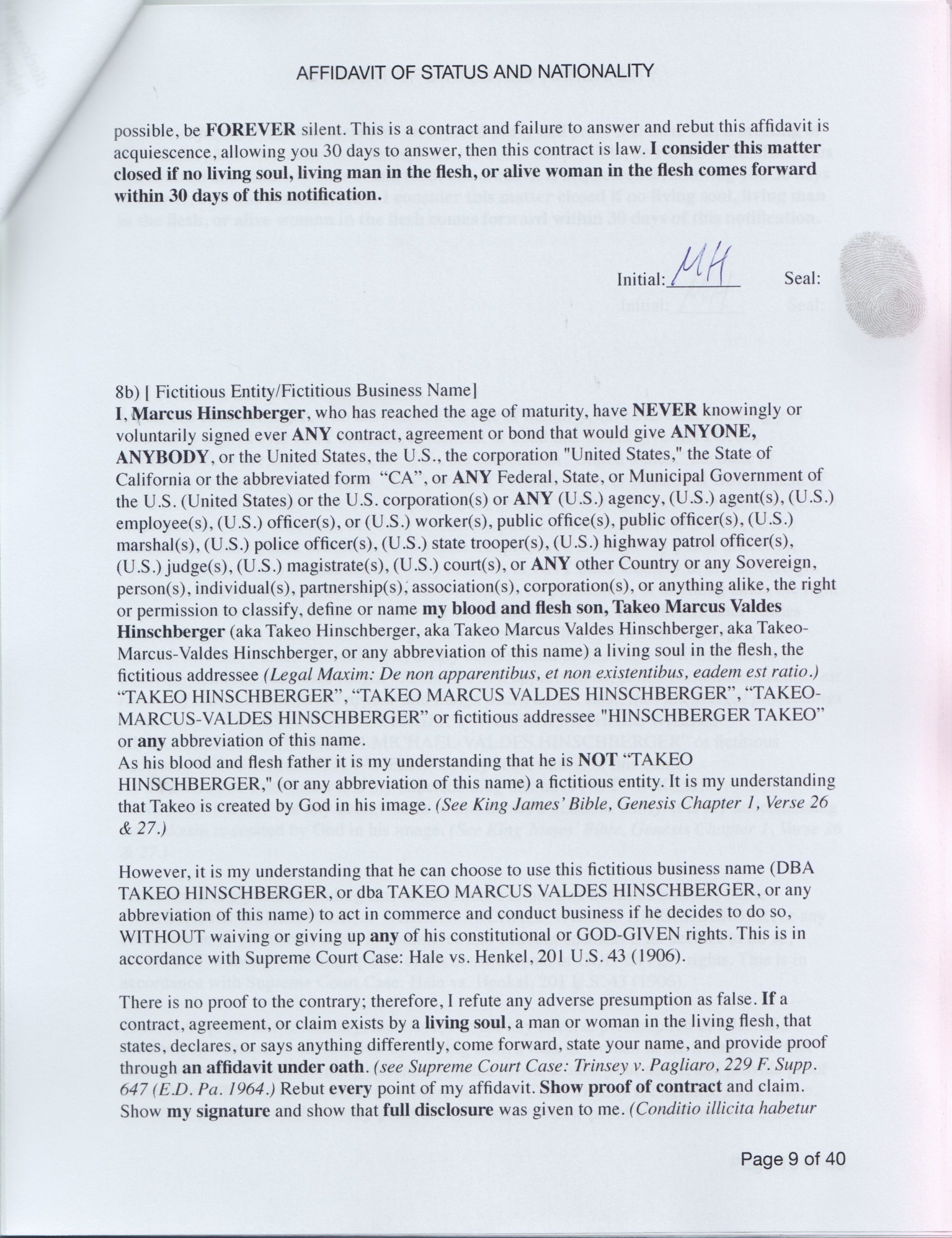 The affiant Marcus Hinschberger, a peaceful, non-combatant Californian National, publishes the following Notices and/or Affidavits on this page.
