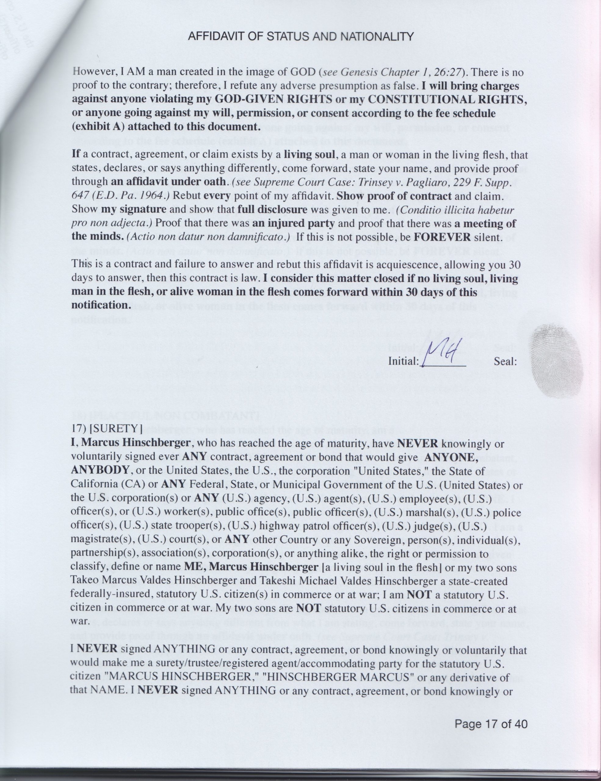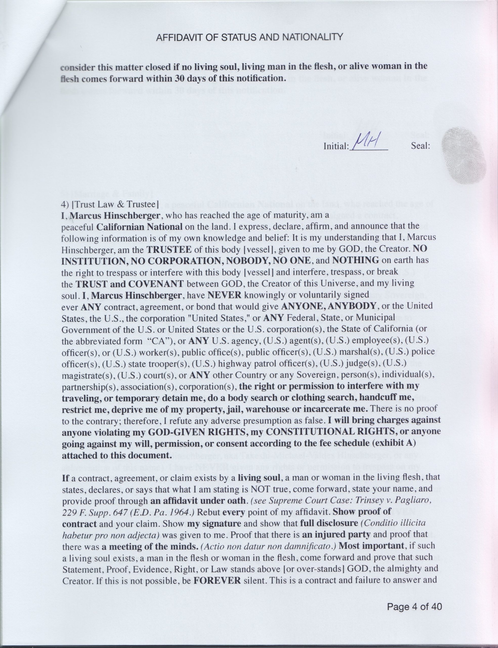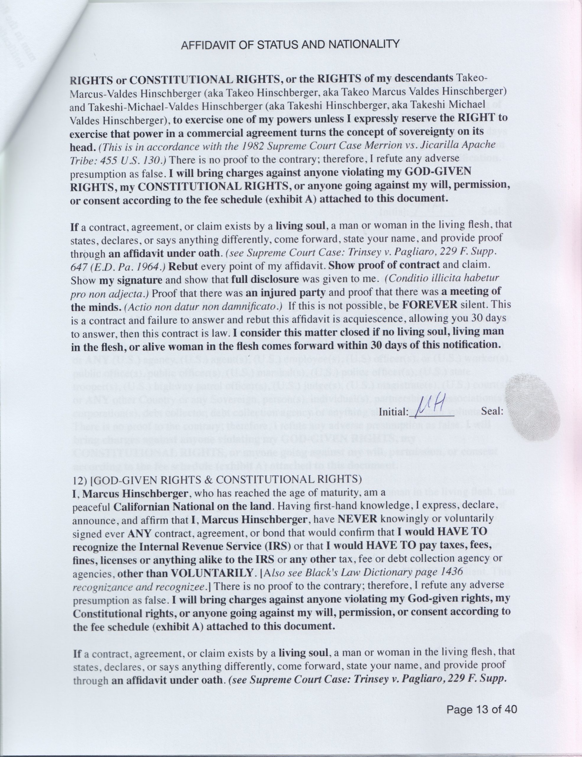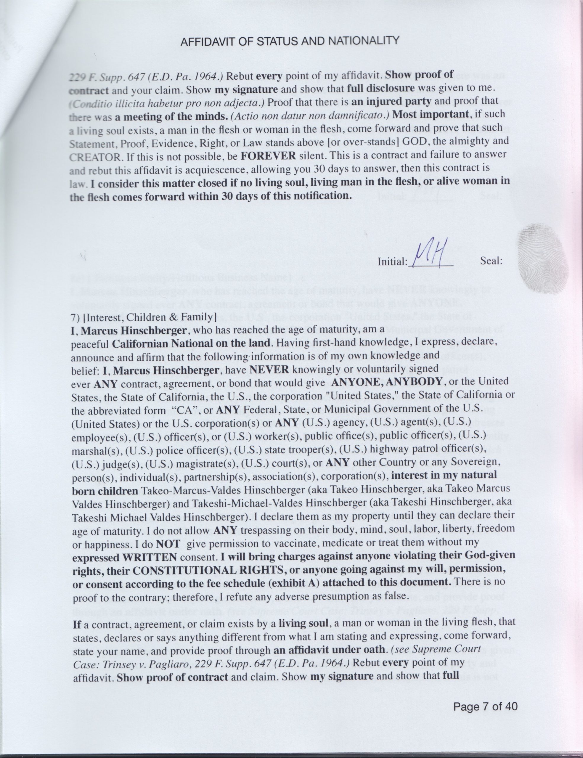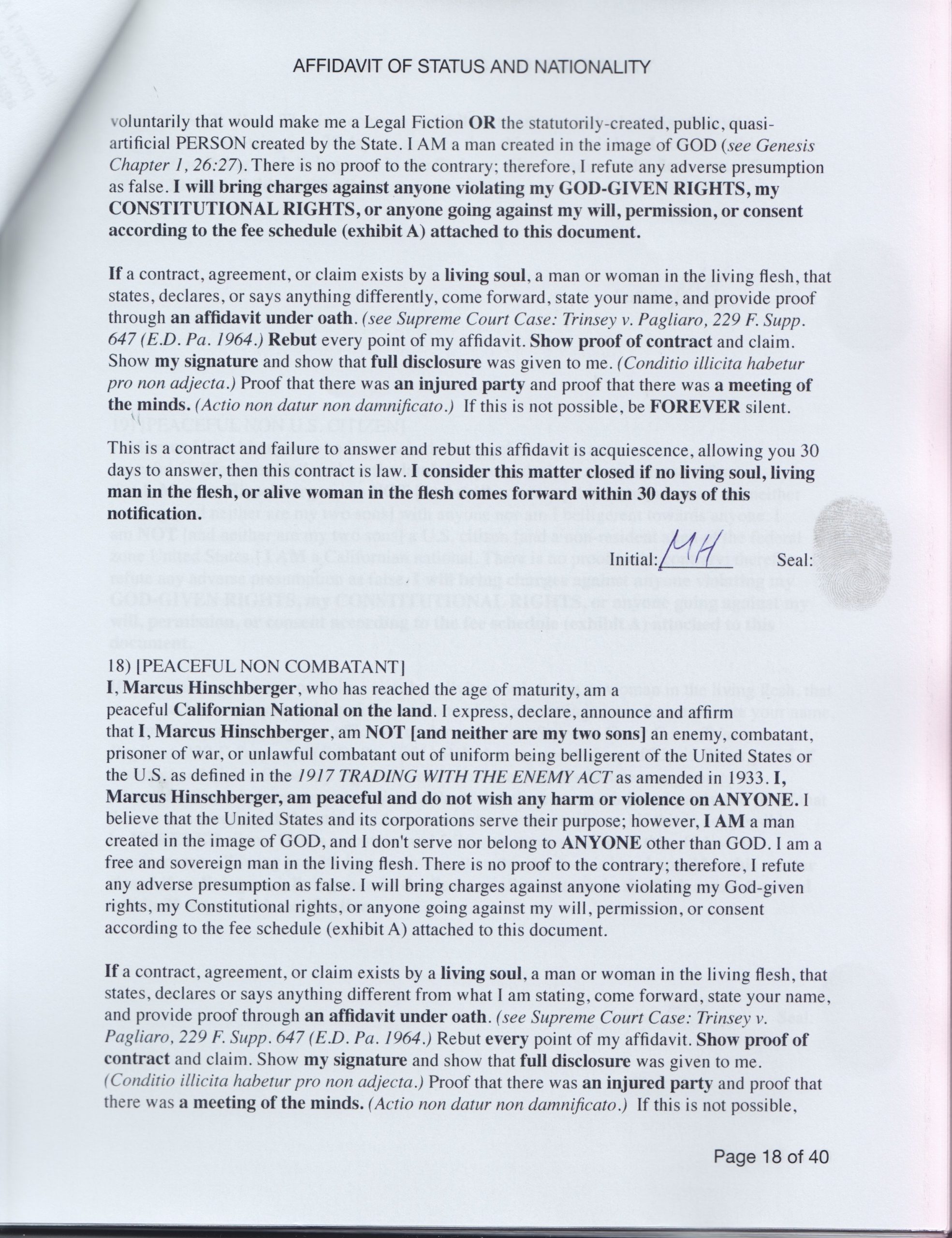 The affiant Marcus Hinschberger, a peaceful, non-combatant Californian National, publishes the following Notices and/or Affidavits on this page.
