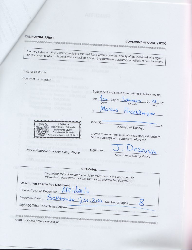 This affidavit was notarized in the County of Sacramento, California on August 22nd 2023 under the laws of the United States of America [see USC 1746 Section 1].