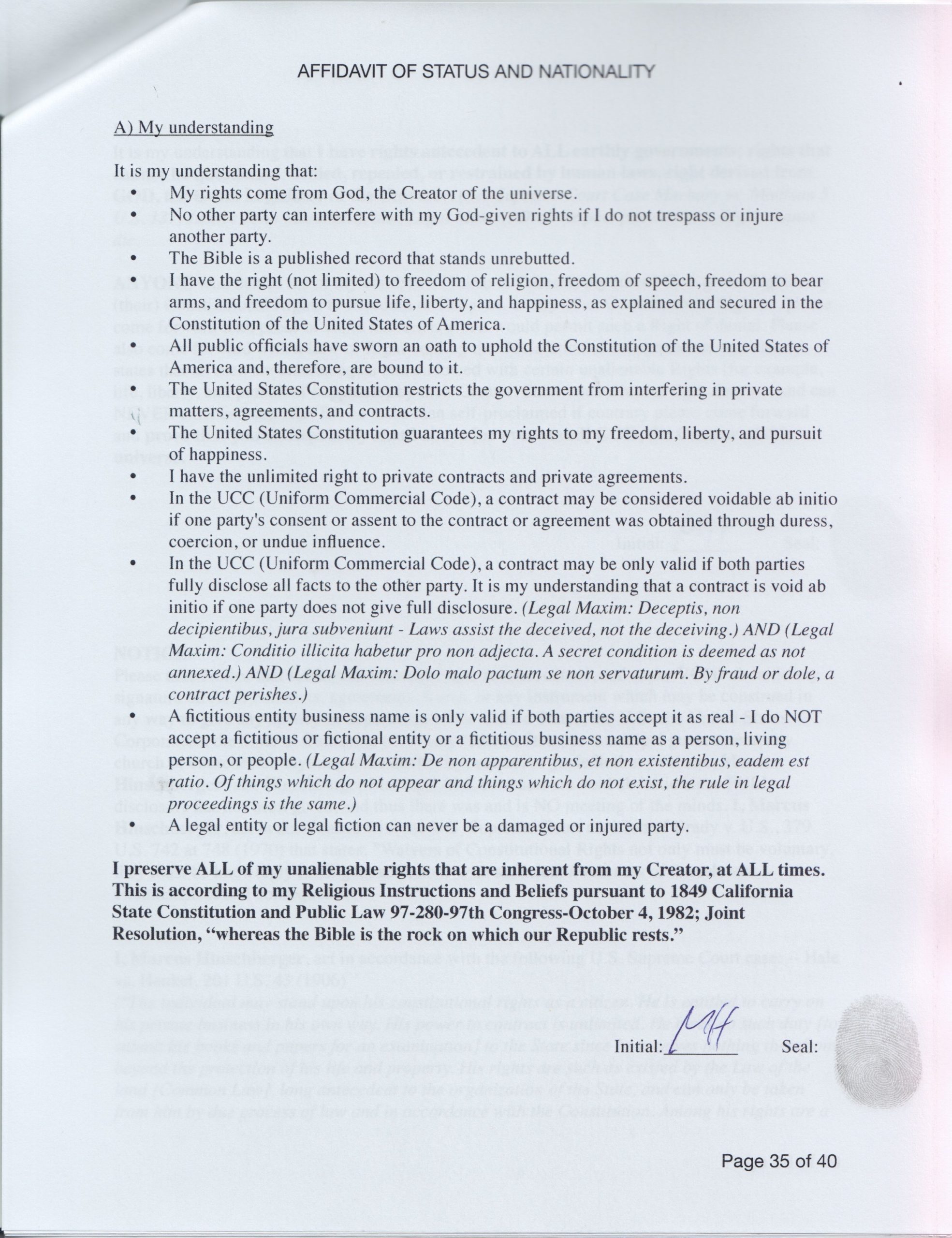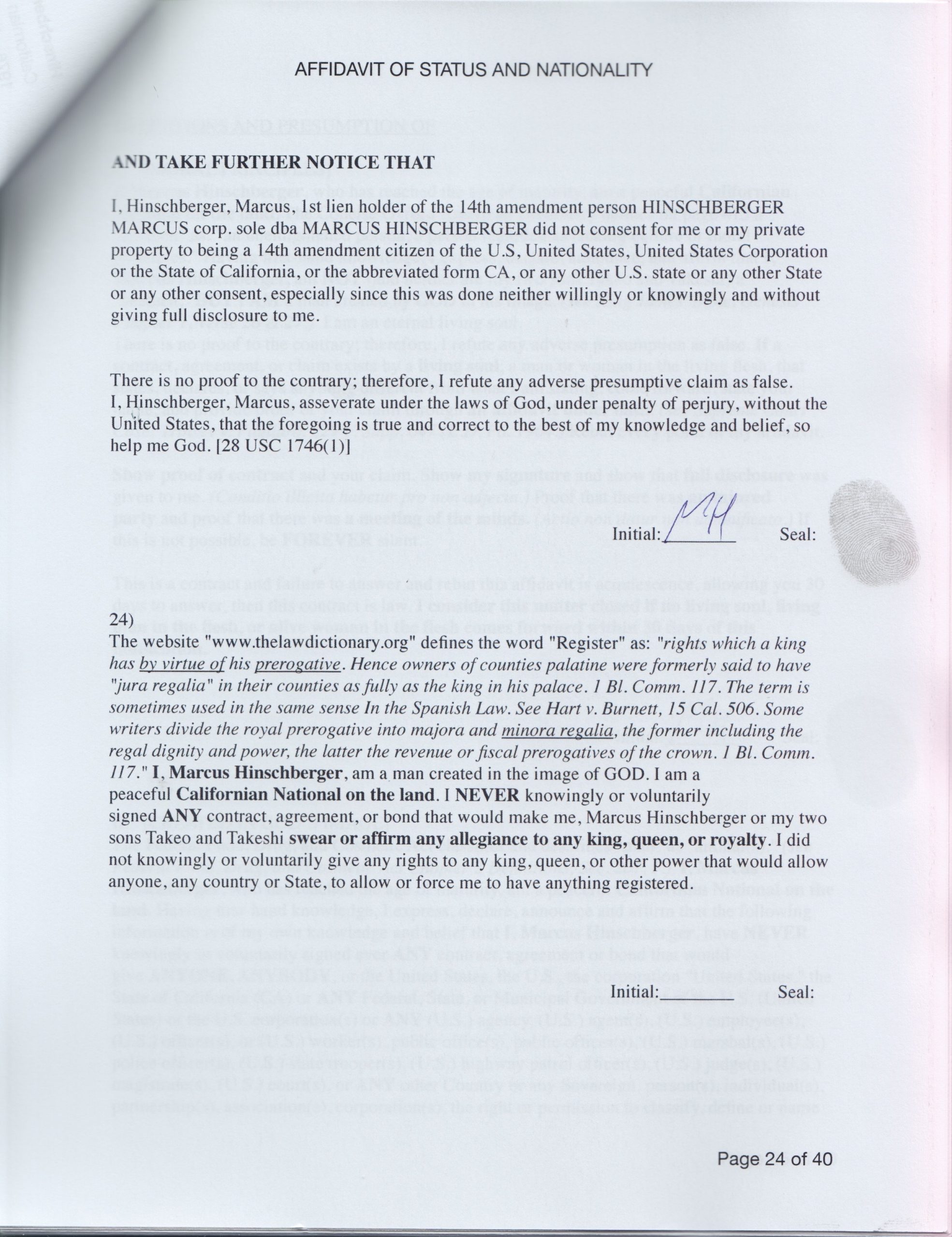 This affidavit was notarized in the County of Sacramento, California on January 24th 2024 under the laws of the United States of America [see USC 1746 Section 1] and declared, affirmed and announced to be a national and NOT a 14th Amendment Citizen.