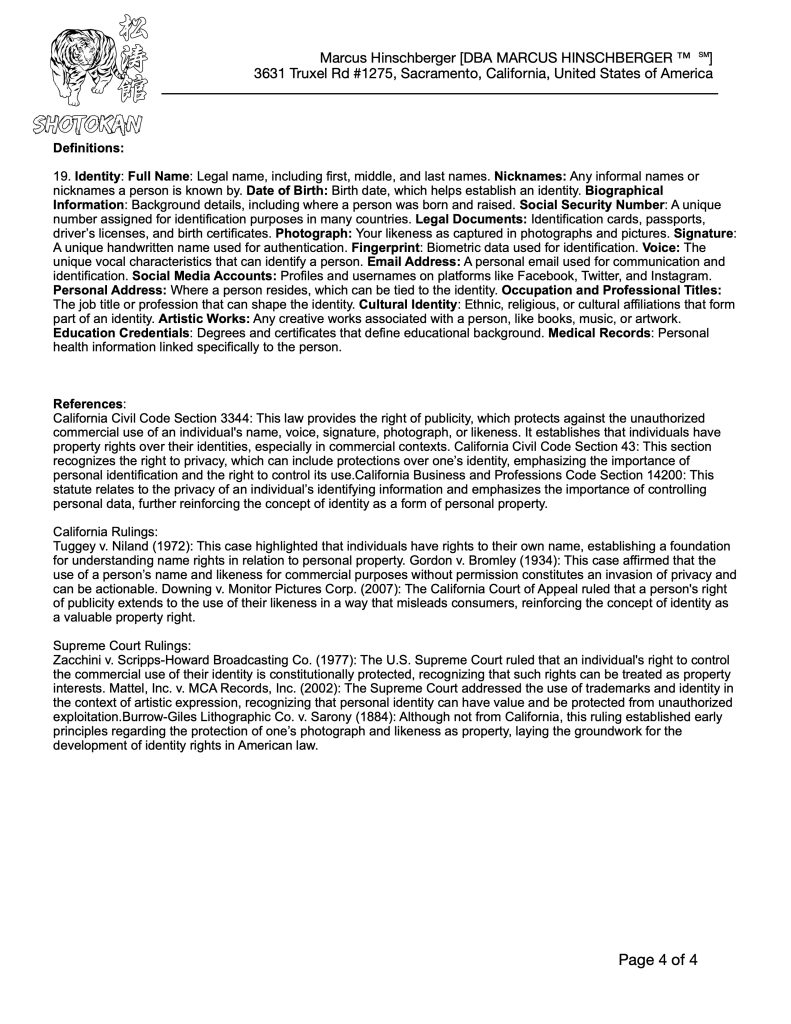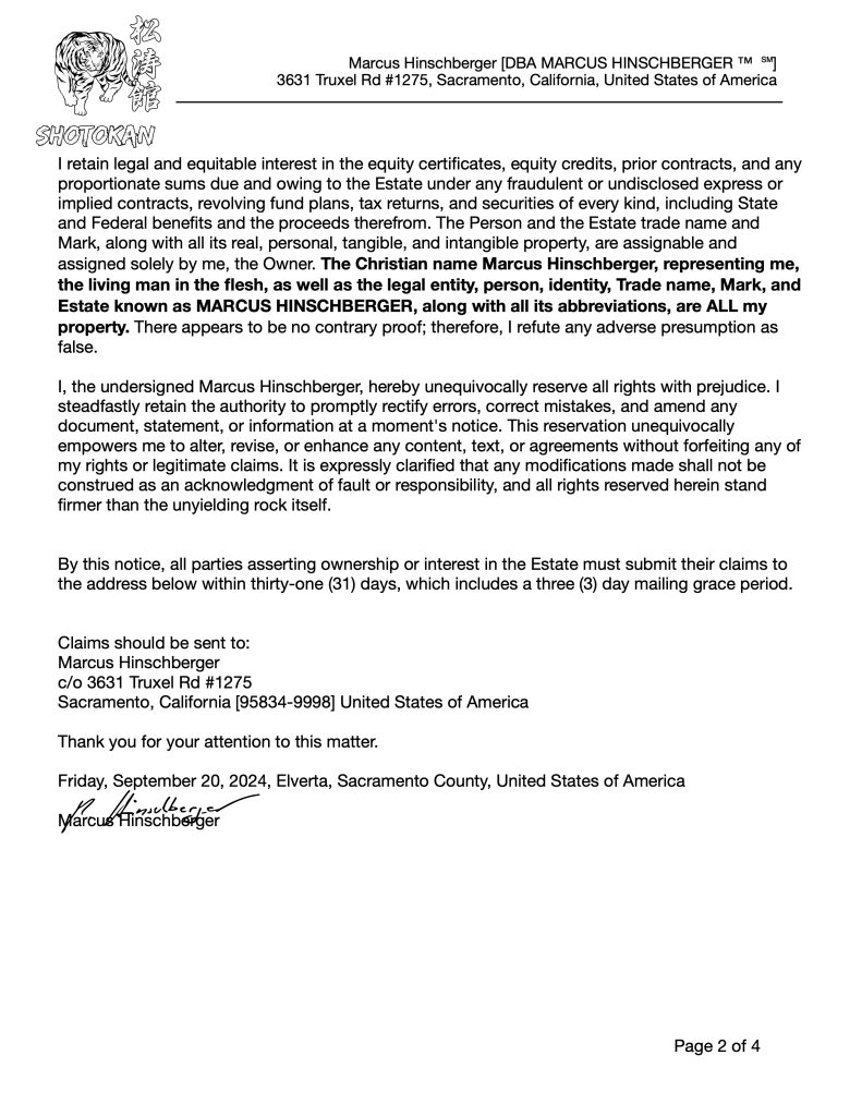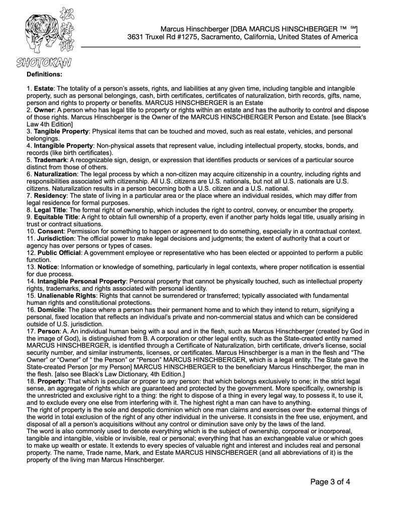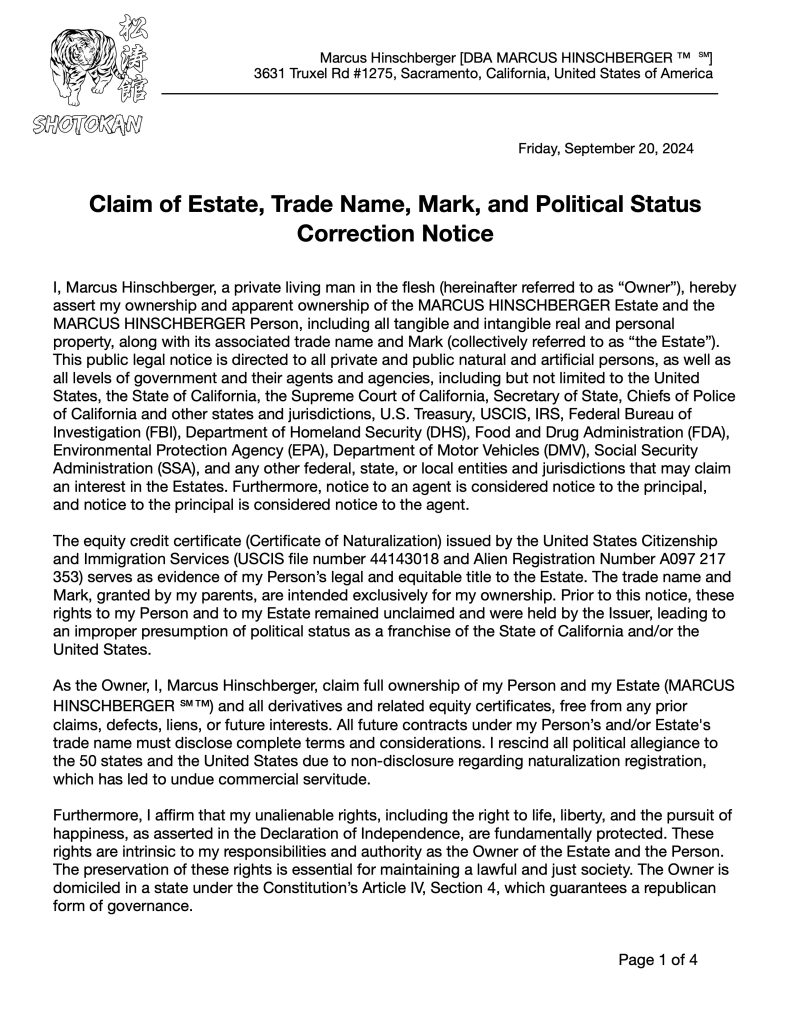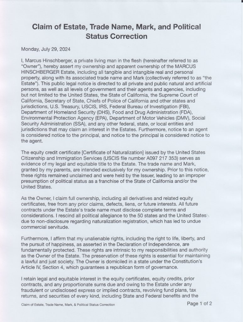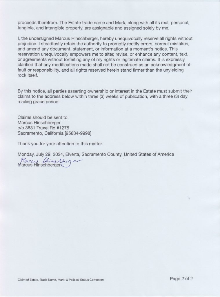 Claim of Estate, Trade Name, Mark, and Political Status Correction