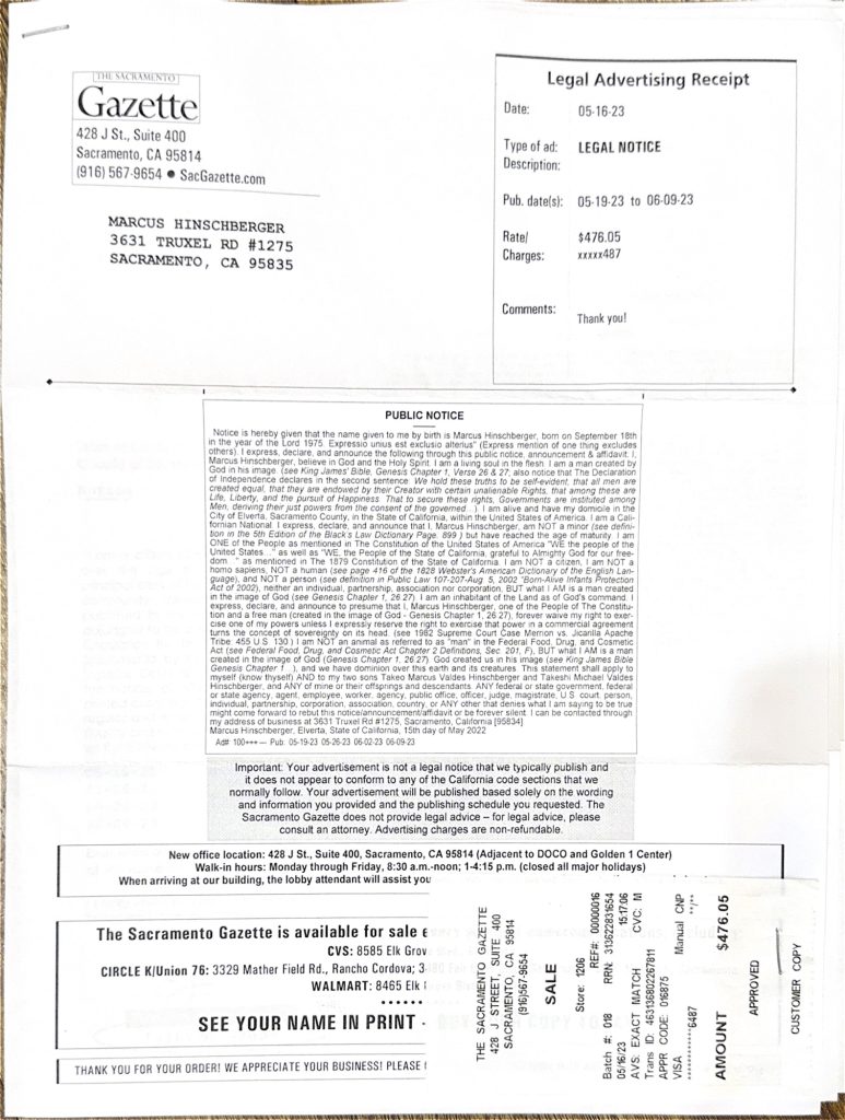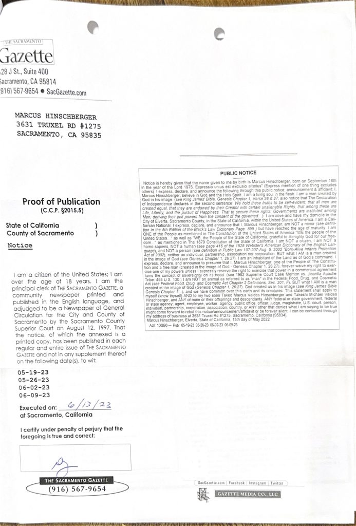 The affiant Marcus Hinschberger, a peaceful, non-combatant Californian National, publishes the following Notices and/or Affidavits on this page.